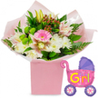 Welcome a newborn baby girl with our beautiful pink and white floral bouquet. This elegant arrangement features a delightful combination of gerberas, rose lilies, chrysanthemums, and striking red hypericum, all complemented by fresh greenery for a vibrant look.